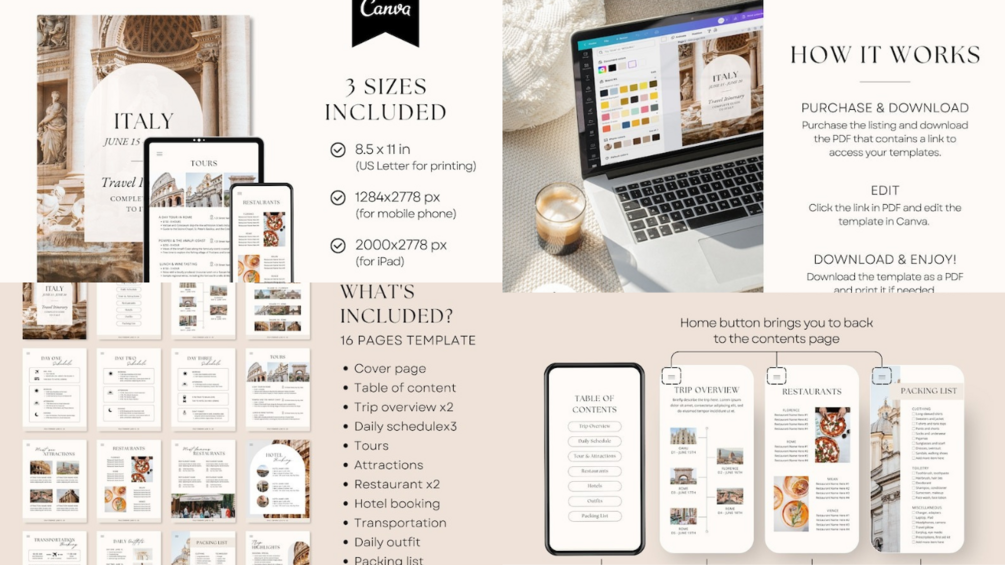It's a simple way to keep all the information in one place, including your daily itineraries, hotel, transportation, tours, and packing list! Get this template and plan your next trip with this mobile digital travel guide. It's great for weekends, birthdays, honeymoon trips!
