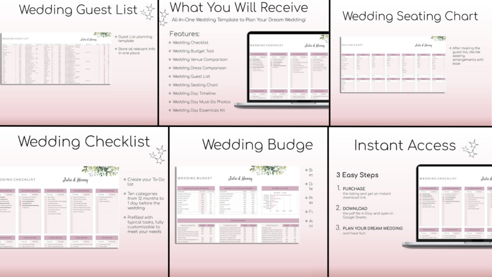 PDF file with a link to your Wedding Planner spreadsheet - Checklist for all your to-dos, conveniently all in one place - Wedding budgeting template - Wedding dresses comparison template - Vendors list - Venue options comparison template - Drafting the guestlist - Guestlist - Seating chart template - Wedding day timeline - Must-do photos plan - Wedding day essentials kit